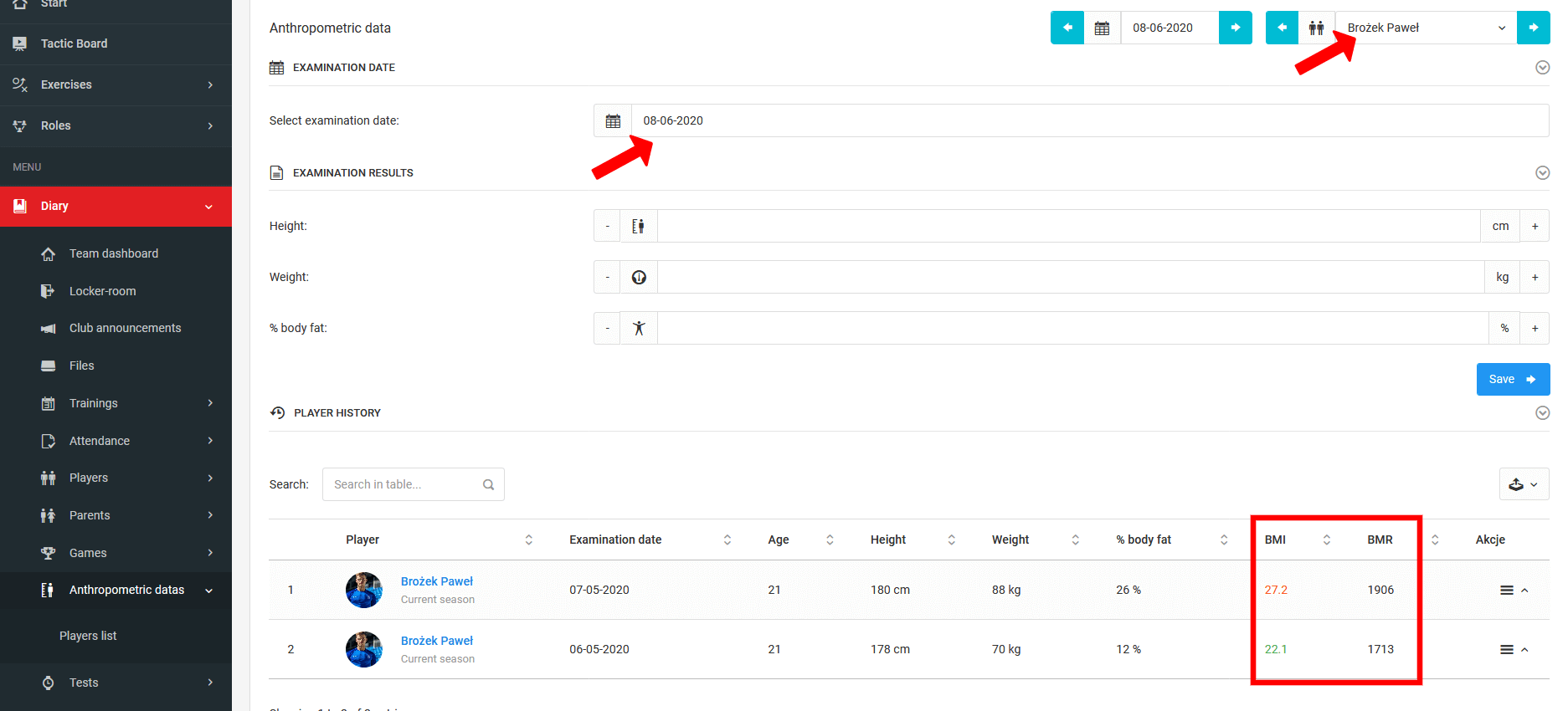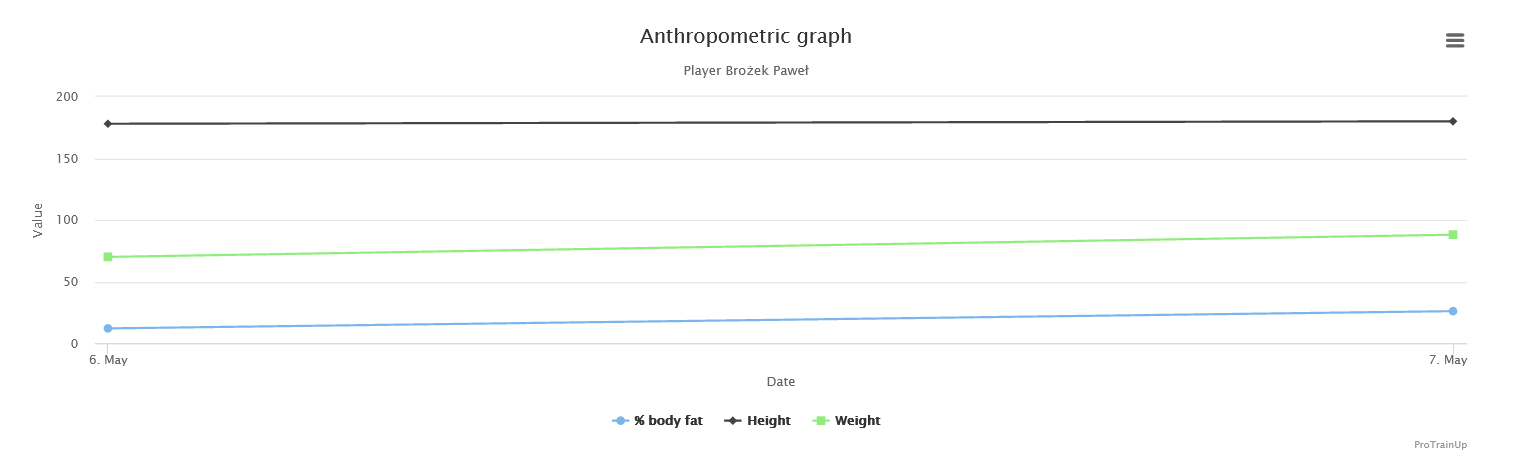 Pro zadání antropometrických údajů vyberte z levého menu: deník antropometrická data seznam hráčů a tam vedle hráče klikněte na ikonu "vyplnit".