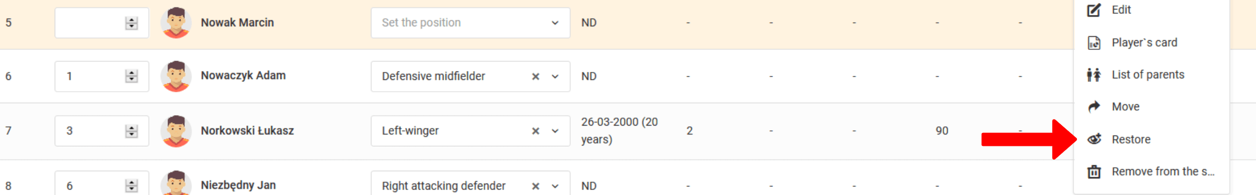 Η διαγραφή ενός παίκτη είναι μια μη αναστρέψιμη διαδικασία από το επίπεδο λογαριασμού χρήστη, γι 'αυτό να είστε προσεκτικοί. Εξετάστε την επιλογή απόκρυψης, ίσως η απόκρυψη ενός παίκτη θα είναι αρκετή για εσάς. Για να αφαιρέσετε έναν παίκτη, επιλέξτε "αφαίρεση από την ομάδα" από το μενού του. Η διαγραφή θα έχει ως αποτέλεσμα τη μόνιμη κατάργηση του προφίλ του παίκτη μαζί με όλα τα στατιστικά στοιχεία και τα δεδομένα που έχουν αποθηκευτεί στην τρέχουσα σεζόν. Αξίζει να σημειωθεί ότι αυτός ο παίκτης θα εμφανίζεται σε όλες τις προηγούμενες σεζόν και όλα τα δεδομένα του από προηγούμενες σεζόν θα εξακολουθούν να είναι διαθέσιμα στο σύστημα. Διαγράφετε πάντα έναν παίκτη από την τρέχουσα ομάδα και την επιλεγμένη σεζόν.