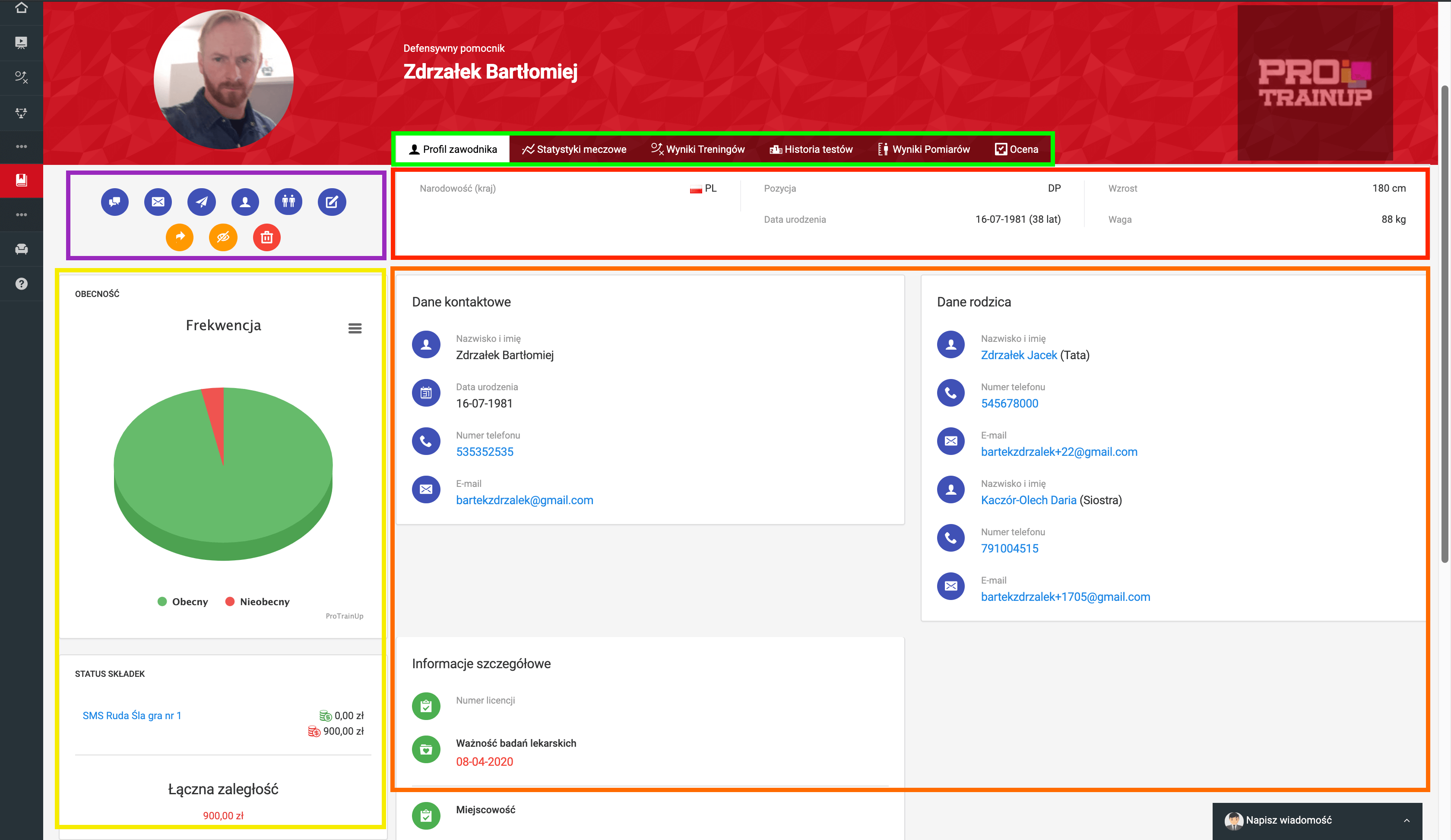 Profil zawodnika składa się z kilku sekcji, które na powyższym obrazku zostały oznaczone kolorami. Kolor zielony, to lista zakładek, których kliknięcie spowoduje przejście do odpowiedniej sekcji profilu zawodnika. Kolor fioletowy, to menu funkcyjne, które pozwala uruchomić takie działania jak: edycja profilu, usunięcie profilu, ukrycie zawodnika czy też przesłanie mu wiadomości prywatnej lub maila. Kolor czerwony, to sekcja przedstawiająca metryczkę zawodnika wraz z danymi antropometrycznymi. Kolor żółty, to sekcja z informacjami na temat frekwencji oraz kwestii związanych ze składkami. Kolor pomarańczowy, to sekcja zawierająca dane personalne zawodnika i jego opiekunów.